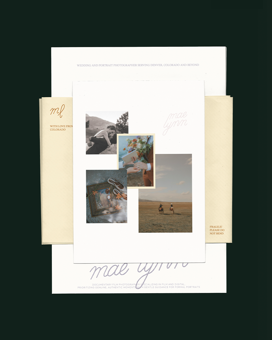 Mae Lynn is a film photographer specializing in weddings and portraits, based in Denver, Colorado. Mae’s work is grainy, colourful, and artfully composed. Fuelled by sentimentality and the fleeting nature of moments, Mae captures light and emotion in an incredibly unique and gorgeous way. Mae reached out to me to design a brand that encapsulated all of the above.